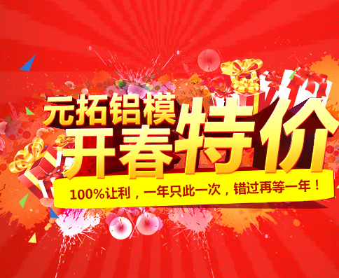 誰(shuí)說(shuō)鋁合金模板太貴?誰(shuí)說(shuō)沒(méi)有優(yōu)惠?羊年元拓鋁模最惠活動(dòng)來(lái)襲,2015年3月2日-2015年3月31日期間元拓集團(tuán)為回饋新老客戶特推出【鋁模?大酬賓活動(dòng)】,鋁模產(chǎn)品百分百讓利,一年只此一次,錯(cuò)過(guò)再等一年!